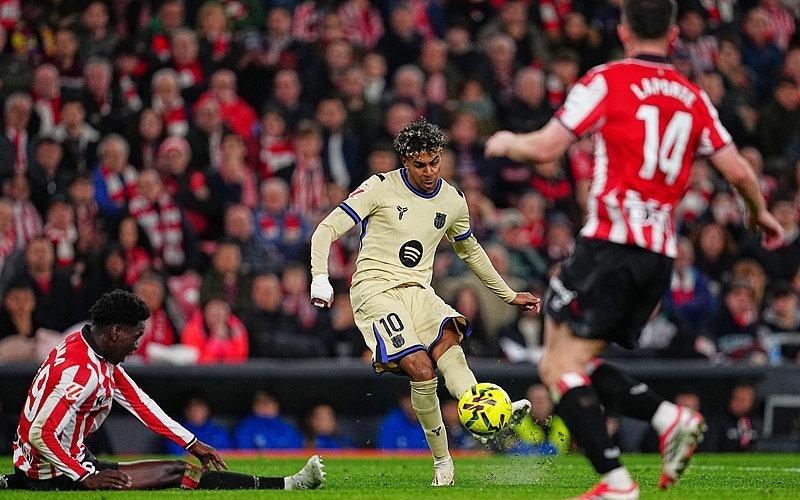 北京时间3月8日,西甲第27轮,毕尔巴鄂竞技主场迎战巴塞罗那。比赛中。图源:视觉中国上半场,双方战成0-0,下半场第68分钟,佩德里左路内切送出妙传,亚马尔跟上停球兜射远角,皮球击中立