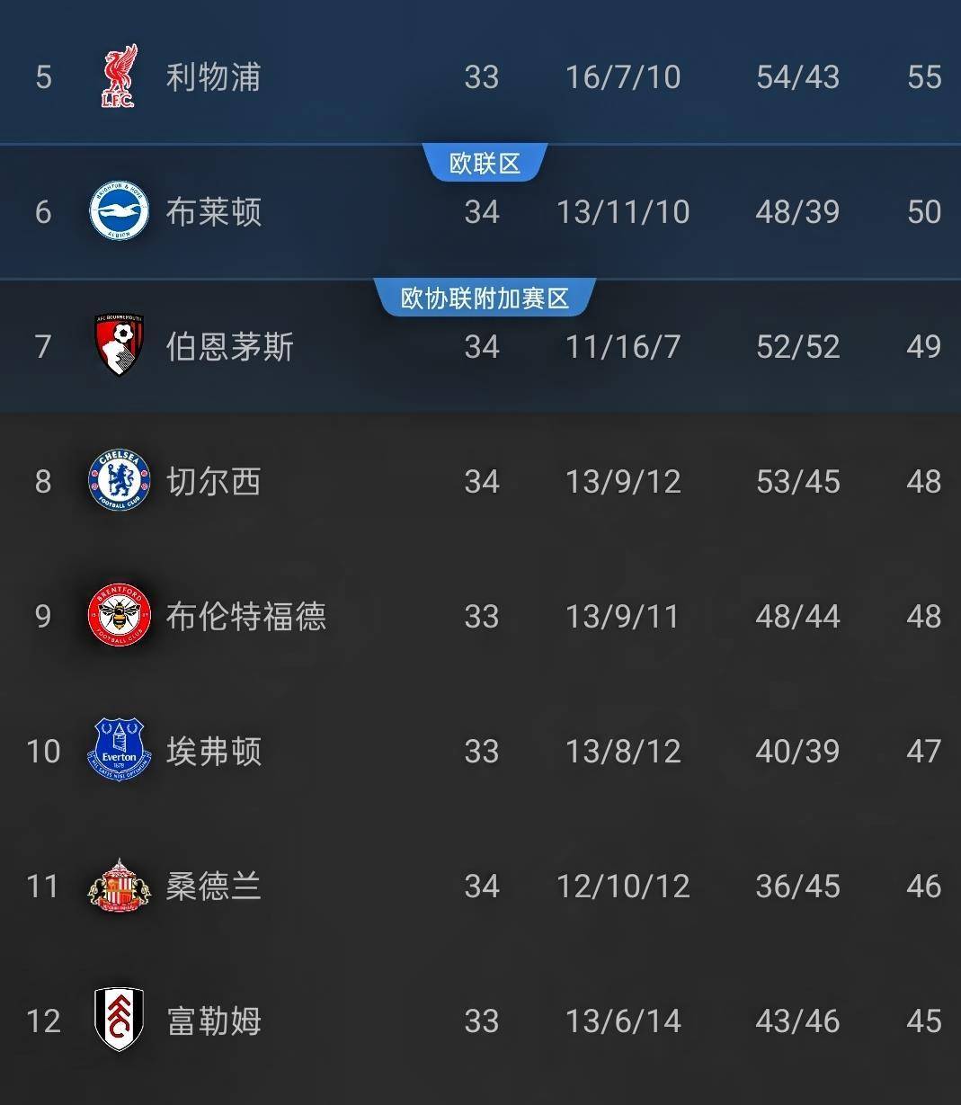 这场比赛是2025-2026赛季英超联赛的第34轮较量。 根据赛前最新的积分榜信息,利物浦在33场比赛过后,取得了16胜7平10负的战绩,累积55分,暂时排在联赛第五位。 他们距离身前的曼联和阿斯顿维拉有3分的差距,而领先排名第六的布莱顿则有5分的优势。 对于利物浦而言,本赛季争夺联赛冠军的希望早已破灭,他们目前最现实的目标就是保住前五名的位置,以确保获得下赛季欧冠联赛的参赛资格。