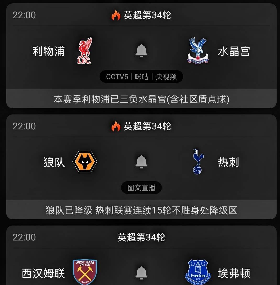 央视体育频道CCTV5将对本场比赛进行现场直播,让中国球迷能够同步见证这场充满恩怨情仇的英超对决。 无论是利物浦球迷期盼的复仇,还是水晶宫球迷希望见证的“四杀”,这场比赛都注定不会平淡。 英超联赛的魅力,往往就体现在这种实力与状态、历史与当下、压力与放松的复杂交织之中。返回搜狐,查看更多