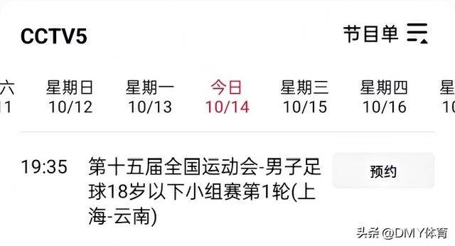 今晚19点35分,CCTV将对全运会足球赛事上海对阵云南的比赛进行现场直播。