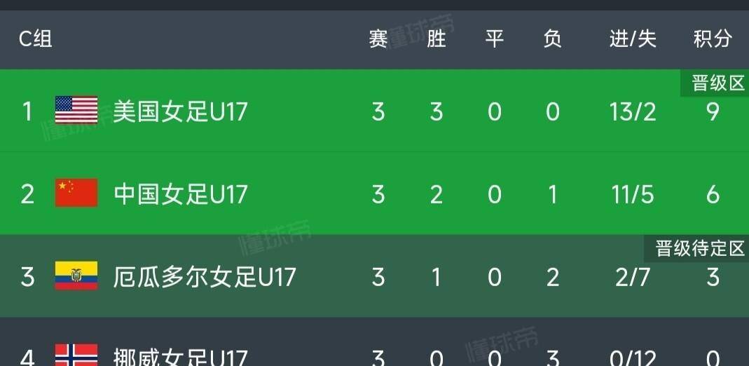 在U17女足世界杯C组末轮中,中国女足4-0大胜厄瓜多尔,周欣怡世界波破门,曾屹婕任意球直接得分,陈睿琳、宋雨各进一球。 球队以2胜1负积6分排名小组第二,成功出线。